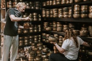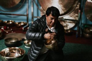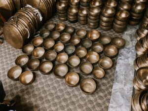 - His team spent hours playing through dozens of antique Thadobati bowls from their collection — first identifying those that aligned with each chakra note, then carefully pairing them to create a set with tones and energy that resonate in harmony.