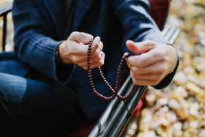 - This beautiful oiled Rosewood from Thailand is hand strung in the shadow of the Boudhanath Stupa in Kathmandu along with an authentic Bodhi Seed guru bead.