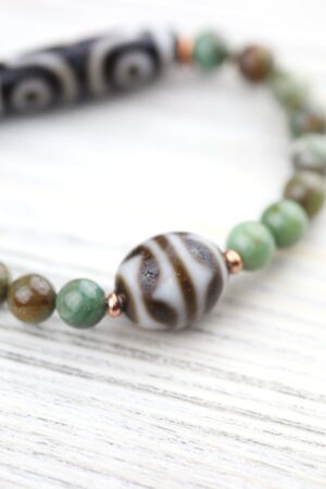 Dzi beads are believed to bring protection and prosperity to the wearer.We loved the idea of combining a Dzi that’s personal to the wearer with one that represents the universe. The Fortune Wave Dzi motif is a very powerful design with the ability to bring multiple fortunes to the wearer.