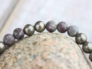 - Hand-strung by our jewelry specialist here in Michigan, this bracelet features 6mm Dragon’s Blood and Pyrite beads on a comfortable, stretchy cord that makes it easy to wear every day. A handcrafted Om bead from Nepal completes the design—sleek, simple, and timeless, but filled with meaning.