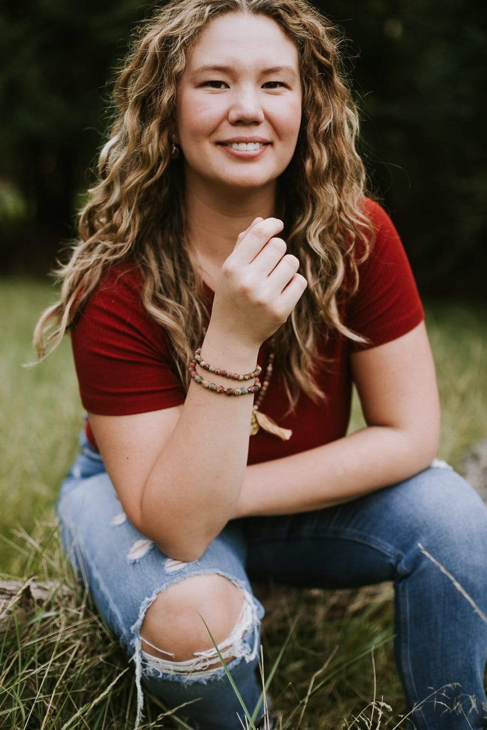 - The earthy and woodsy color palette of matte Riverstone is accentuated by tiny faceted brass spacers.
