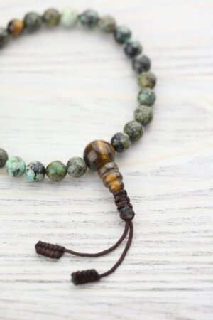 - Our first ever wrist mala that combines African Turquoise with Tiger Eye. Two extremely protective stones that help guide you on your journey.