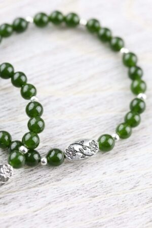 - Features beautiful green Jade beads with a pewter flower charm as its centerpiece.