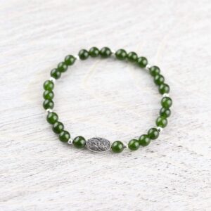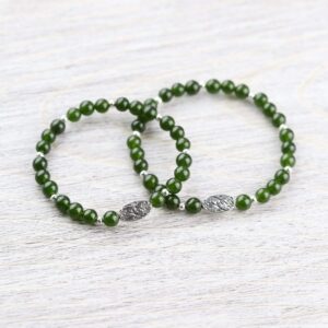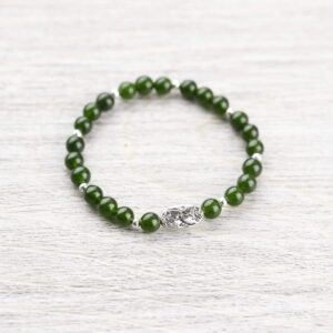 This simple wrist mala is hand strung right here at the DharmaShop in Michigan by our jewelry designer! Features beautiful green Jade beads with a pewter flower charm as its centerpiece.  This bracelet carries a beautiful green energy that activates and stimulates the Heart Chakra. It invites good luck and prosperity i