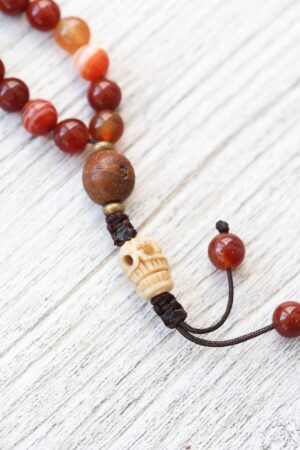 - Made in Kathmandu with 108 Sardonyx Fire Agate beads, four Bodhi Seed accents, and finished with a skull made of hand carved bone.