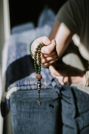 This exclusive DharmaShop mala is a well-traveled one to say the least. We took a stunning Sky Door Dzi from Taiwan, Maha Rudraksha and Jade beads from Nepal, and hand-strung them right here at the DharmaShop using traditional methods and design learned from our Mala artisans in Kathmandu. Aside from it being a gorgeous design, we hope it’s journey to help you on yours is felt.