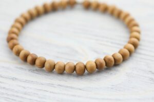 - This DharmaShop essential wrist mala is handmade in Nepal with sweet-smelling Sandalwood beads and one silver spacer.