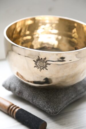 - Sourced on our trip to Nepal in March of 2024, the Sun Bowl features a gleaming gold finish, symbolizing the brilliance of the sun. The hand etched sun design reinforces this connection, while the Sun Mantra, “Om Suryaya Namaha,” honors the sun’s life-giving energy.