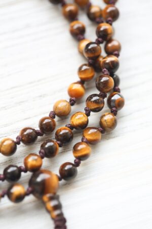 - Made with 6mm Tiger Eye beads, this mala embodies the power of protection and strength. Tiger Eye carries a fierce, grounding energy that helps to balance stability, confidence, and will power.