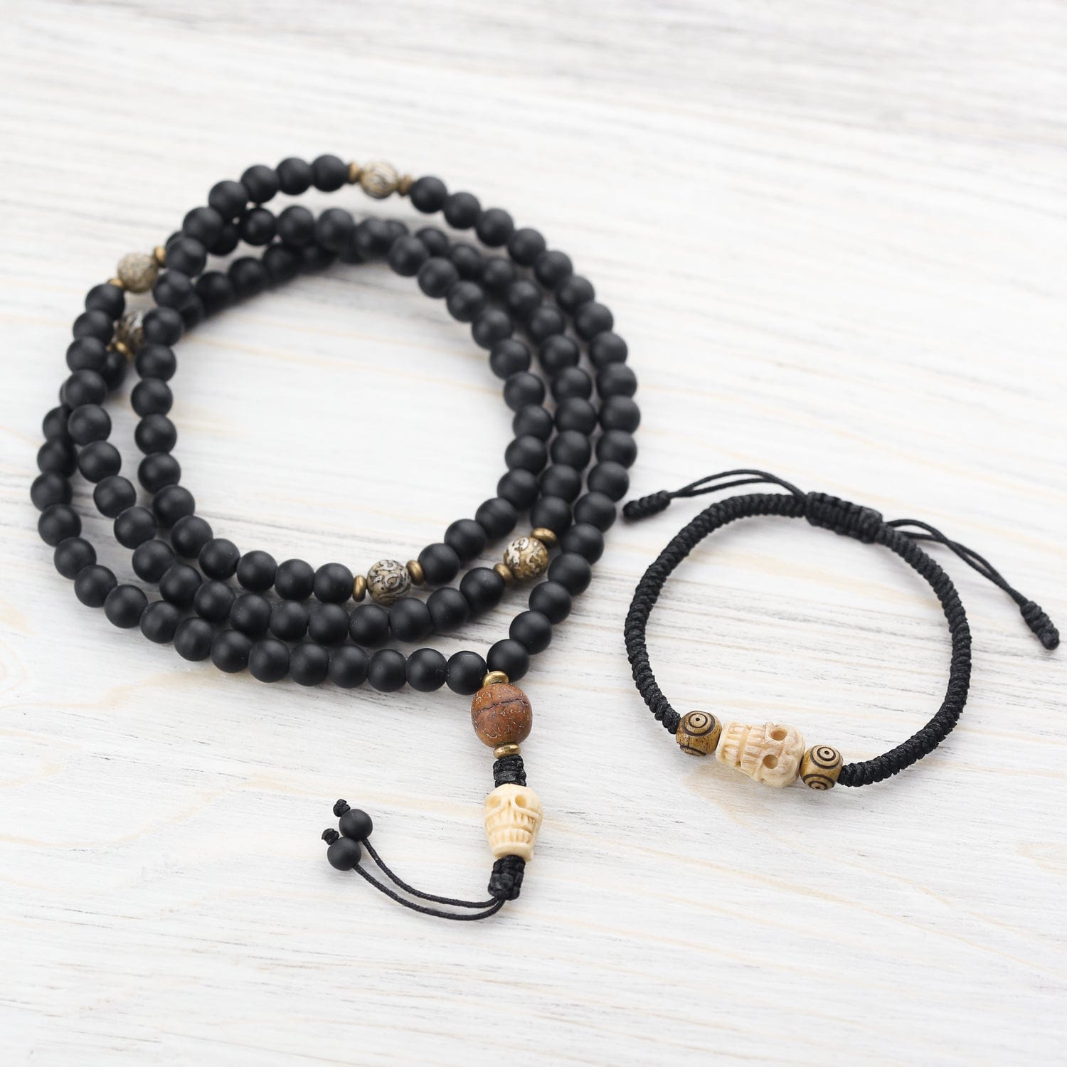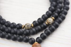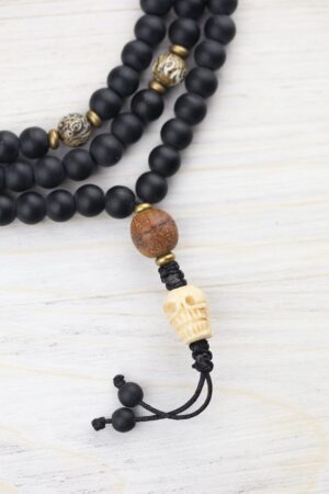 - Features powerful matte Onyx, a hand carved bone skull, Bodhi Seed guru bead, and Naga Shell Om Mani Padme Hum (mantra of compassion) beads whose ink will fade with time as the carvings remain.
