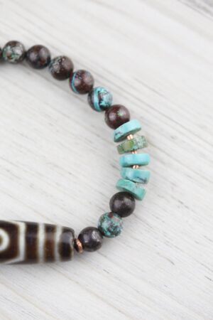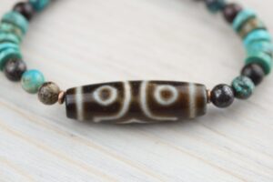 Chrysocolla beads are 6mm, Turquoise beads are 8mm. Dzi is ~1.5″ long.