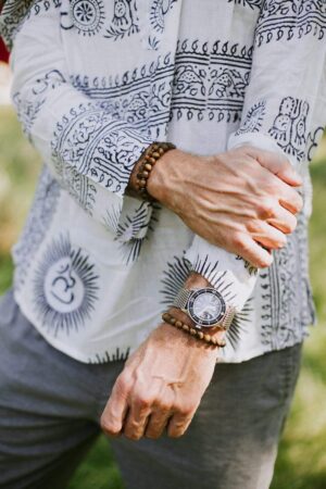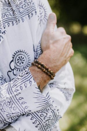 - Our DharmaShop exclusive double wrap bracelet features a combination of matte Tiger Eye beads with brass spacers.